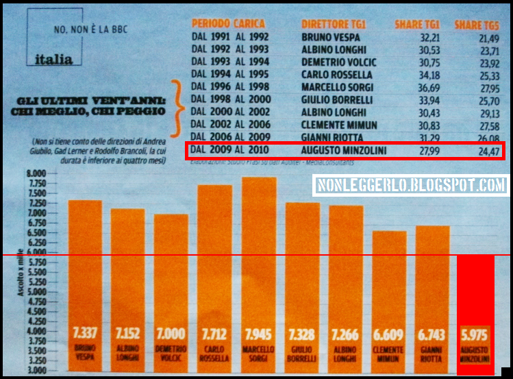 Augusto Minzolini è il peggior direttore degli ultimi 20 anni. Lo dicono i dati auditel. Lo share del Tg1 si attesta attorno al 27% ed è in continuo calo: Nell'ultima settimana ha perso mezzo punto al giorno